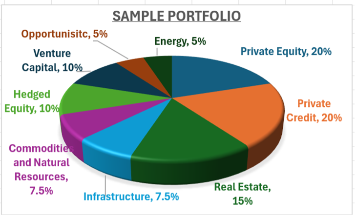 An illustrative diversified alternative allocation for a high-net-worth investor might feature:
